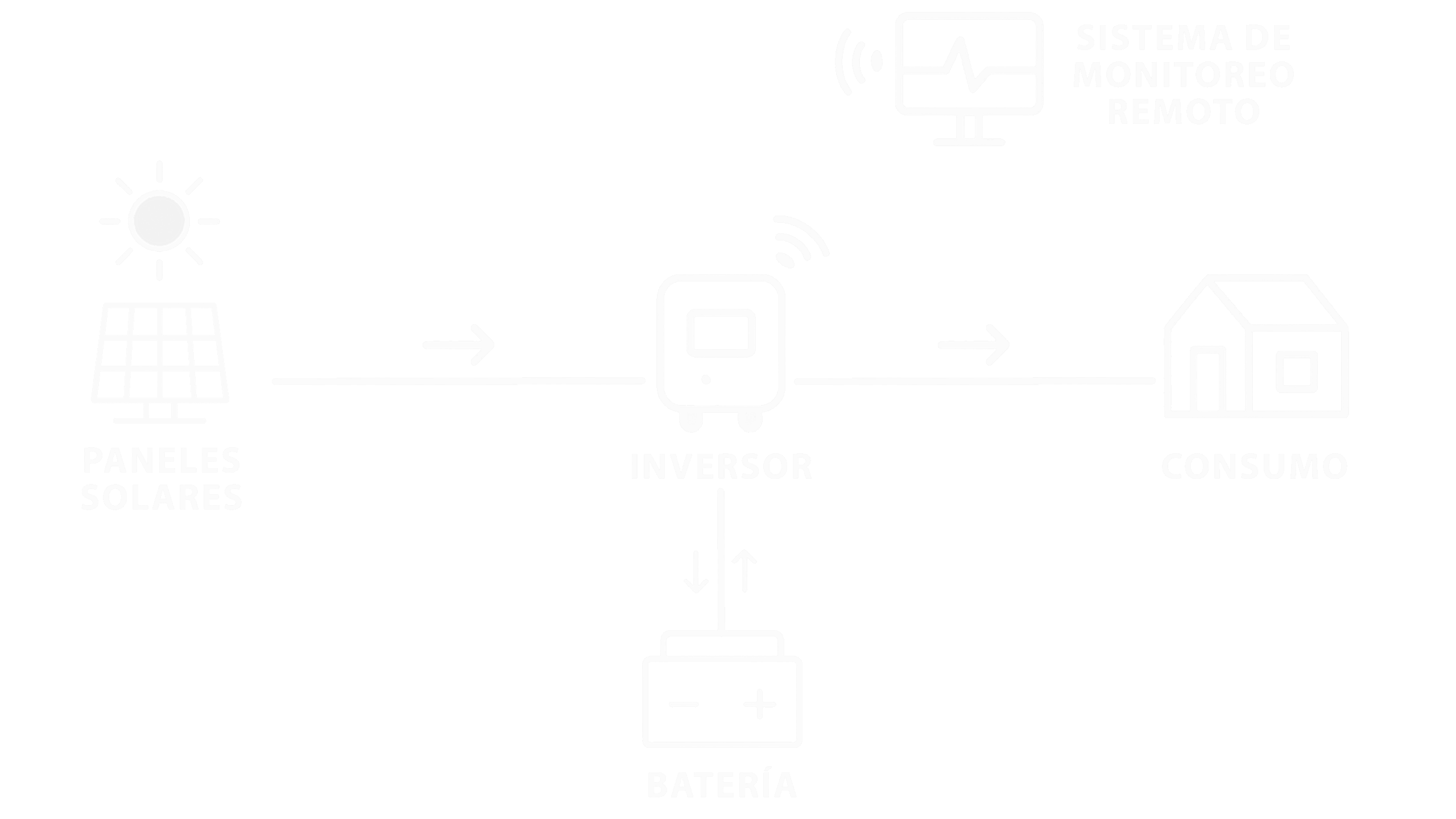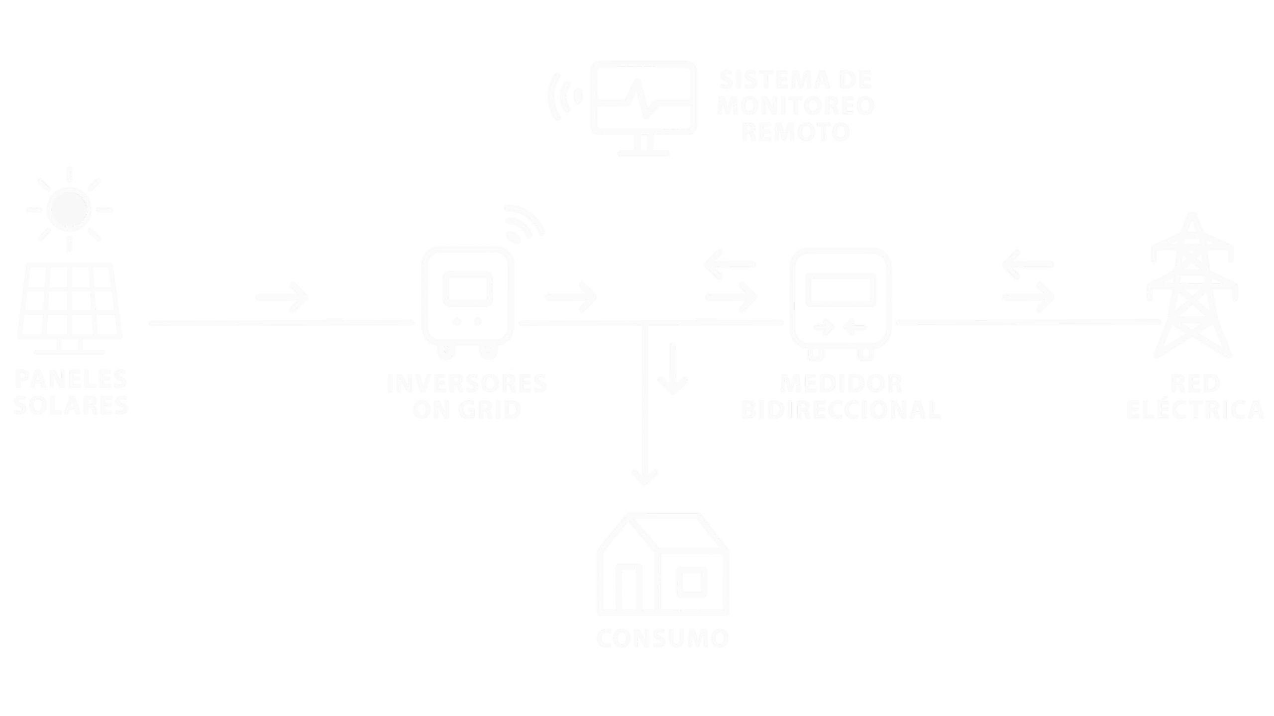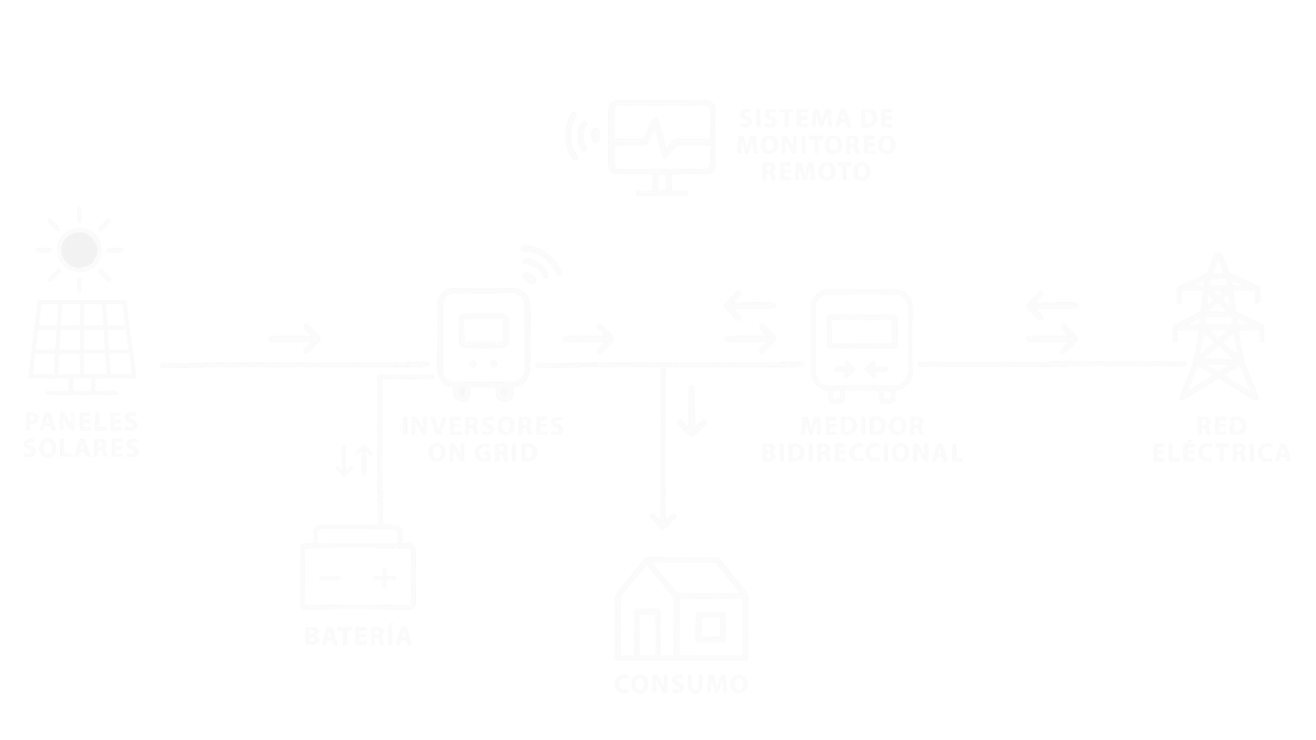 Este tipo de sistemas está compuesto por paneles solares, inversor de corriente continua a corriente alterna, tableros de protección CC y AC, y un sistema de monitoreo.